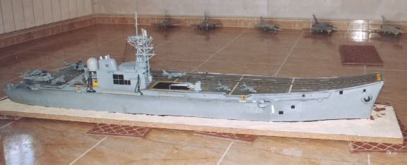 En las ultimas imagenes podeis ver mi particular forma de hacer scrath: se trata, si no me equivoco, de un dispositivo que el buque lleva en lo alto de la isla para ir orientando a los HARRIER durante el aterrizaje. Lo he realizado con tres laminillas de madera (marqueteria) recortada y lijada hasta conseguir el tamaño dado por la escala (mirando mil y una fotografias), la base de carton piedra, y la rejilla y demas elementos realizados con alfileres. En la penultima foto he trazado una X en el lugar donde va ubicado una vez acabada la pieza. Por cierto. ¿Conoceis el alfabeto marino de banderas?. ¿Que quieren decir esas tres banderas pequeñas colocadas en la torre-mastil?.
