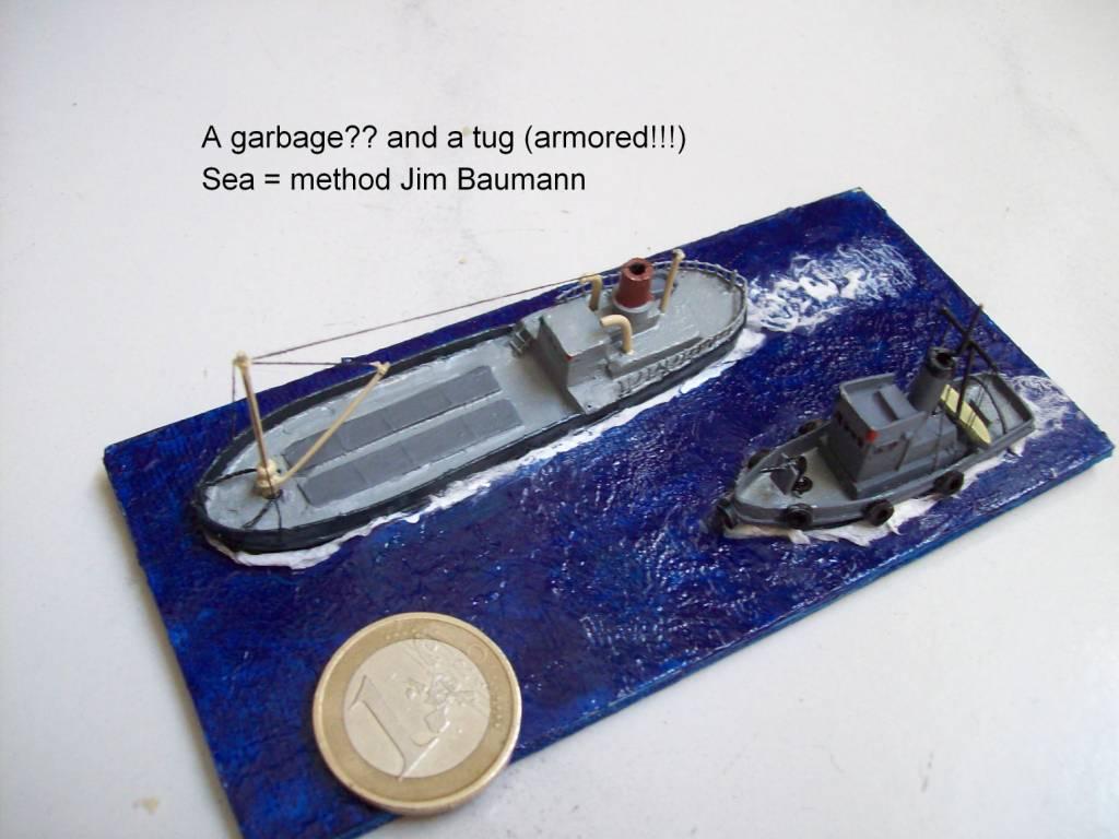 Otras dos fotos de uno de los primeros scracht que trata de representar un trawler ingles. Lo hice sin gran detalle ni darle una terminación más refinada. Las anclas son grapas dobladas y el railing es cinta tapagrietas. El remolcador otro pequeño invento. El macro mata muchas fotos, pero ha servido para posteriores trabajos. Saludos.