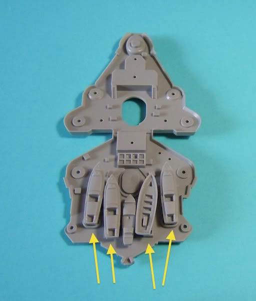 Se trata de ocho unidades de no muy buen acabado, - Este es uno de los talones de Aquiles de la casa -, pero bastante mejor que las del Ark Royal. Vease además como Airfix ha vuelto a caer en los mismos errores. - Flechas amarillas -.