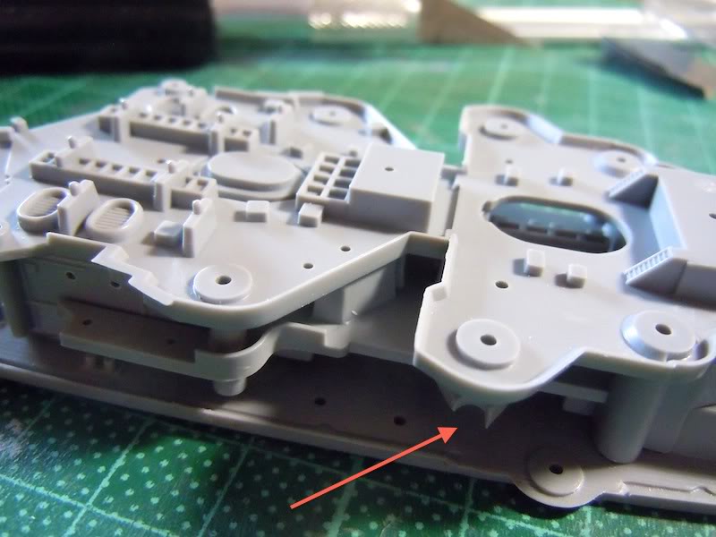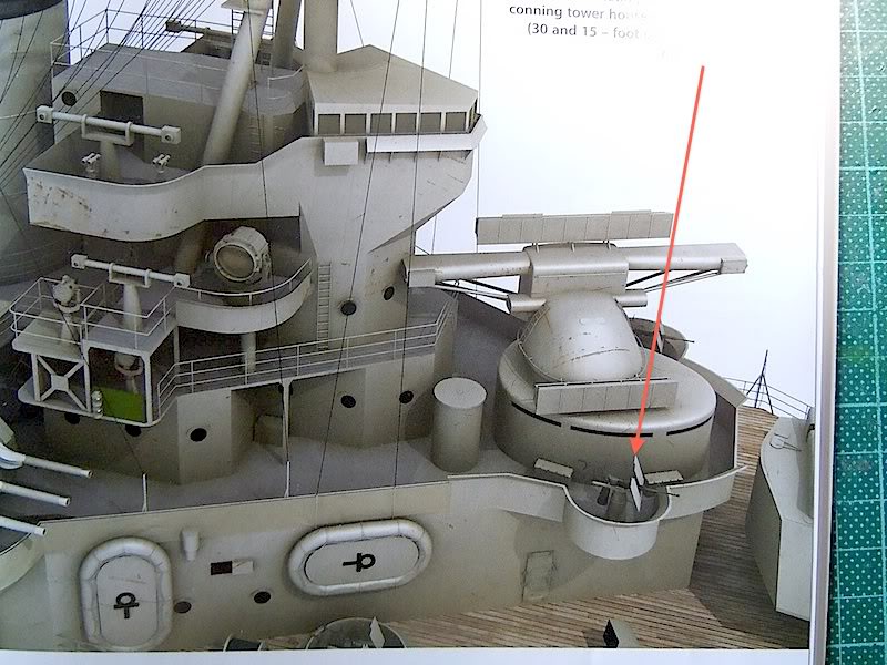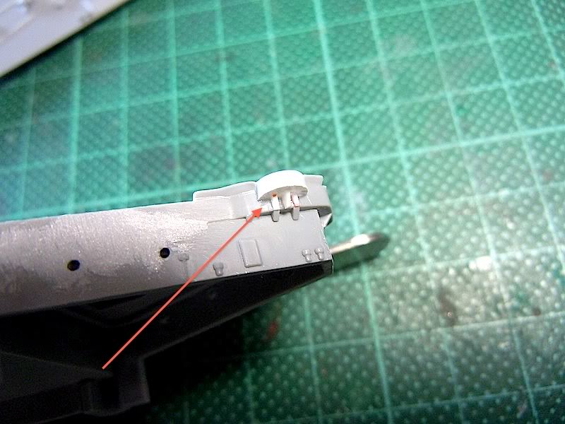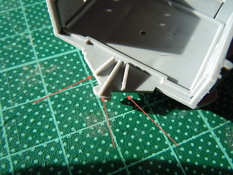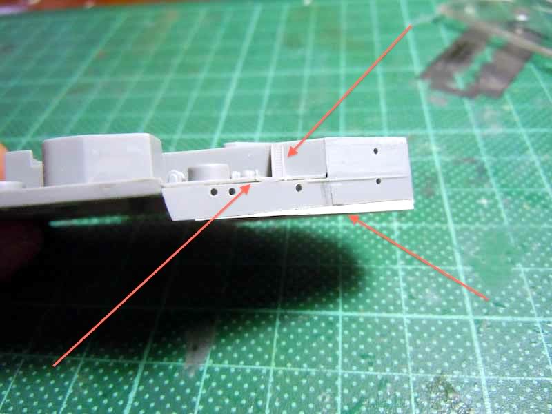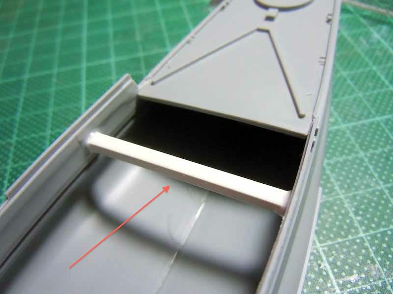 Las flechas indican la ubicación de estas estructuras que en la realidad fueron metálicas y que sustentan a dos grandes barcas. Una vez eliminadas, he añadido un pequeño tambucho que no figura en el kit. Véase :