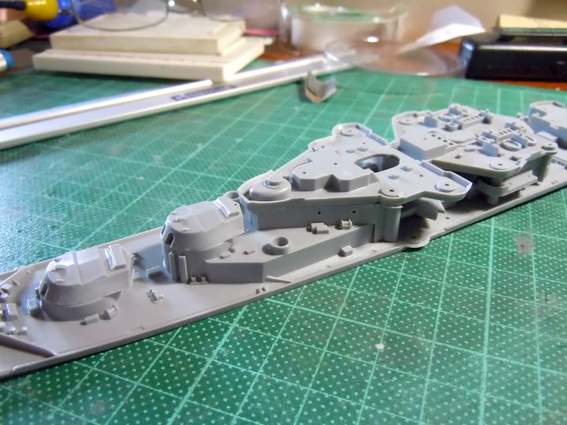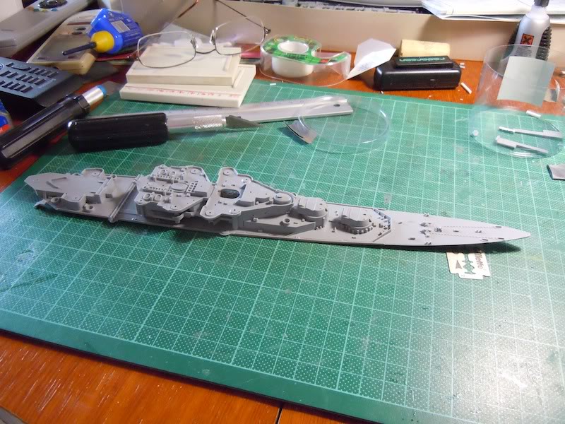 Bueno, pues, una vez terminado el " Adelgazamiento " de las paredes de todas las barbetas que he pillado, he decidido retomar las construcción de las barcas, que no botes, de la superestructura central. Teniendo en cuenta que sería muy conveniente, una vez finalizado el acabado de las dichas, pintarlas todas al unísono y teniendo en cuenta que ha de ir en concordancia su color con el de la super-estructura citada, tomo la resolución de posponer por el momento lo de las barcas y centrarme en la súper-estructura. Veamos algunos aspectos de su modificación:
