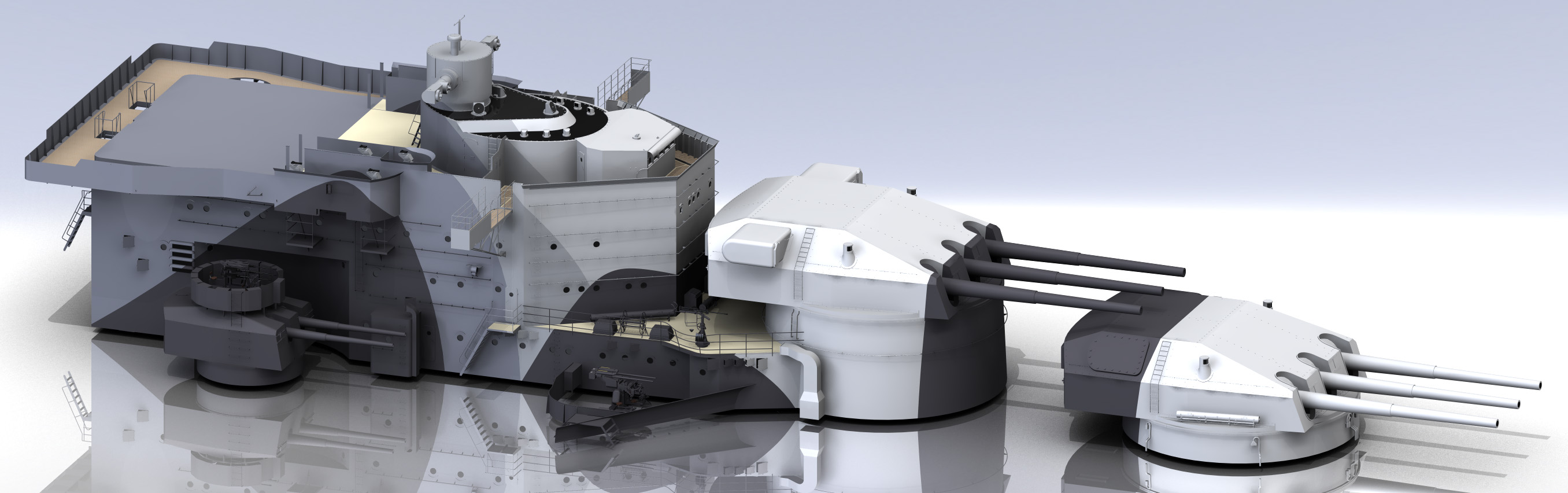 De momento, he dejado pintadas  las torretas de 280 mm. Si os fijais, llevan algún que otro FG y el blanco está tratado con gris claro muy diluido... Los cañones los pintaré mas adelante....