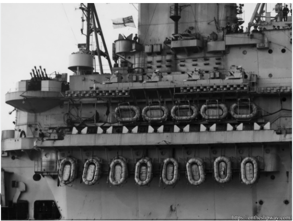 En esta maqueta del HOOD a 1/600 de un reputado modelista, cuyo nombre no diré, se han puesto los Carleys así, sin más. Esto no corresponde a la realidad, estos salvavidas estaban bien trincados a las superficies del buque o de lo contrario con el movimiento del barco se perdería en el mar. Parece que la mayoría  de los modelistas no han tenido en cuenta este detalle.