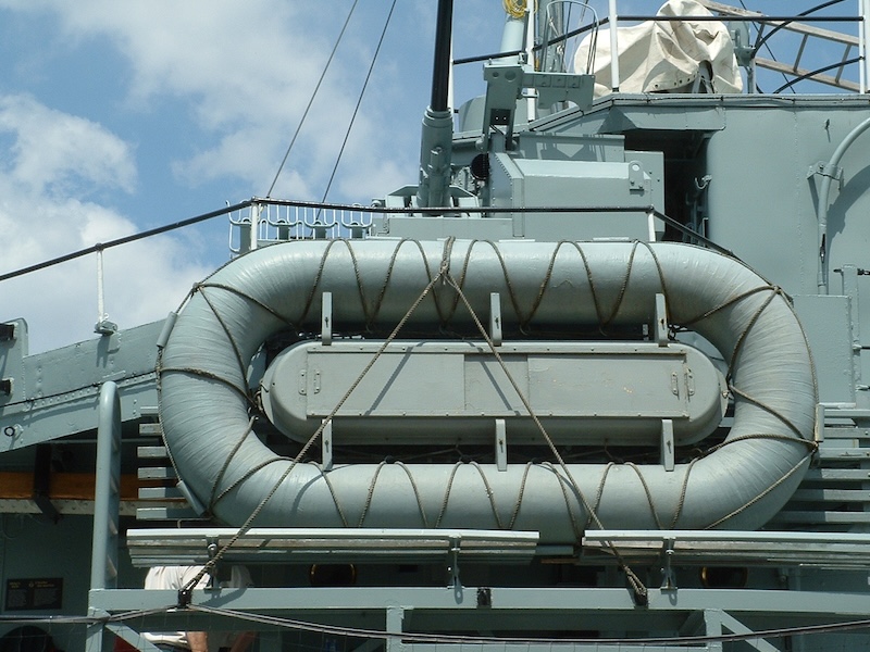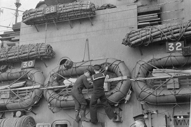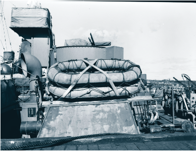En esta vemos trabajando a dos “seamen” en un Carley donde se aprecian las palas y el bichero más cajas pequeñas con útiles, probablemente botiquín u otros efectos necesarios.